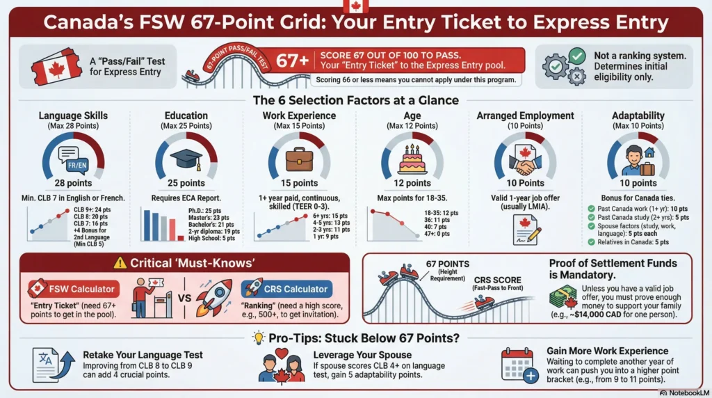 You need to score at least 67 out of 100 points. If you score 66, you cannot apply. If you score 67 or higher, you are eligible to enter the Express Entry pool and wait for an FSW draw. This guide explains exactly how to calculate your FSW selection grid total score in simple language.